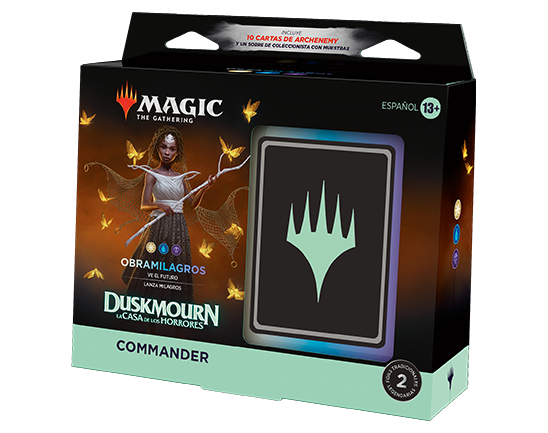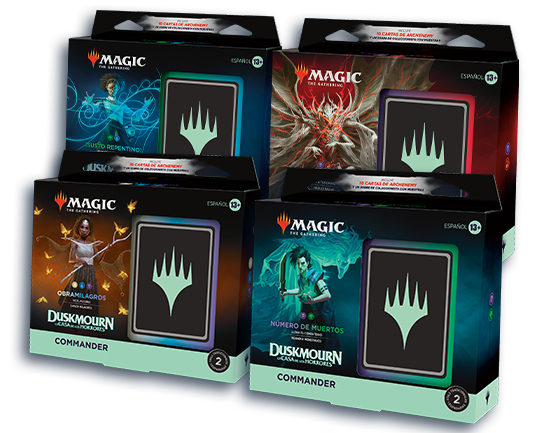 Mazos de Commander de Duskmourn: CONTENIDO: cada mazo de 100 cartas también contiene un sobre de coleccionista con 2 cartas de muestra, 10 fichas de dos caras, 1 contador de vidas y 1 caja guardamazo.